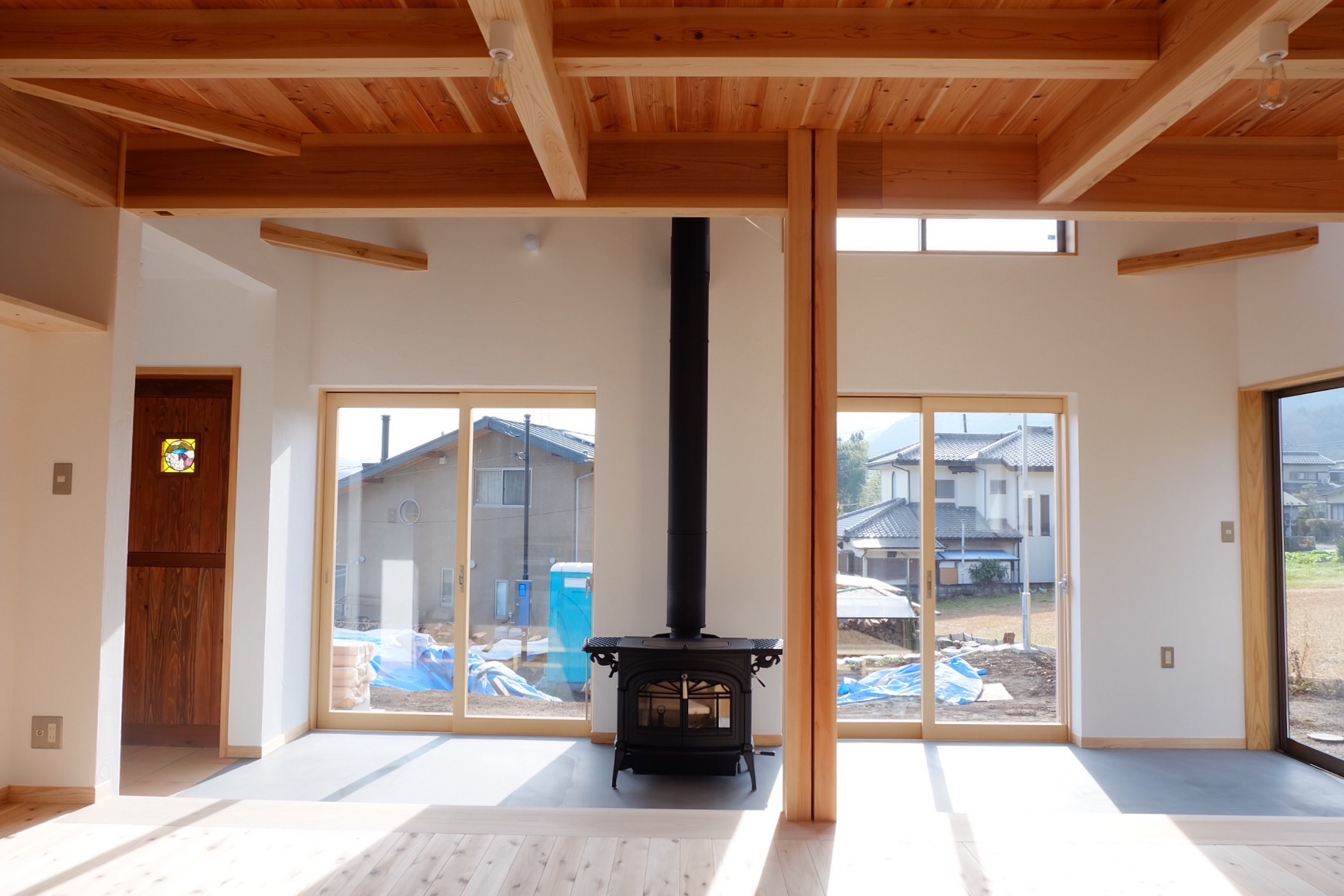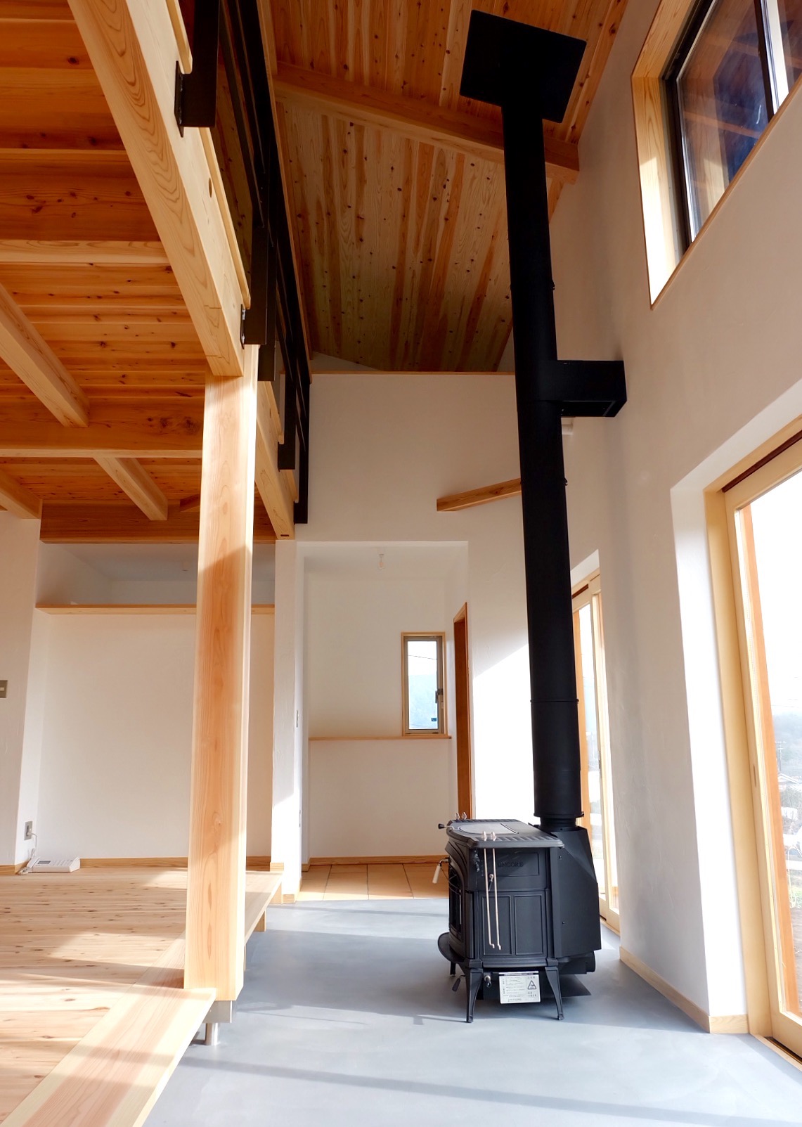 その向こうの山並みと呼応するシルエットの内側は傾斜敷地を利用したスキップフロアの構成。家全体が縦に緩やかにつながるようなプランになっています。