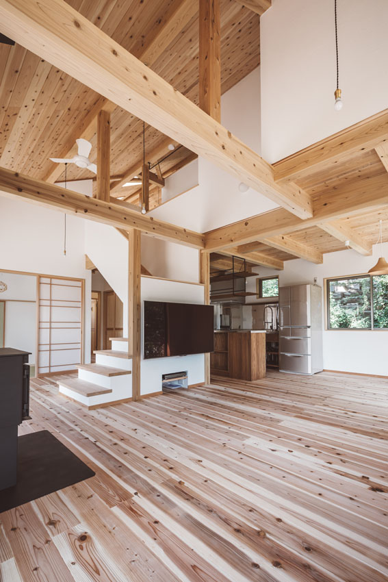 つどいの家 2017.08竣工 セルフビルド / 地産地消 / 漆喰壁 / 白州壁 / 薪ストーブ 大きな屋根のおおらかな大空間の家。たくさんの人たちがワイワイと集うことを想像しながらの家づくりでした。